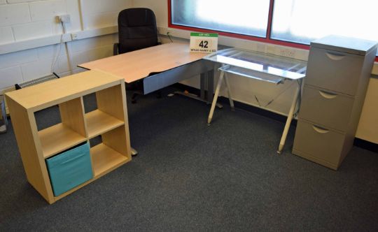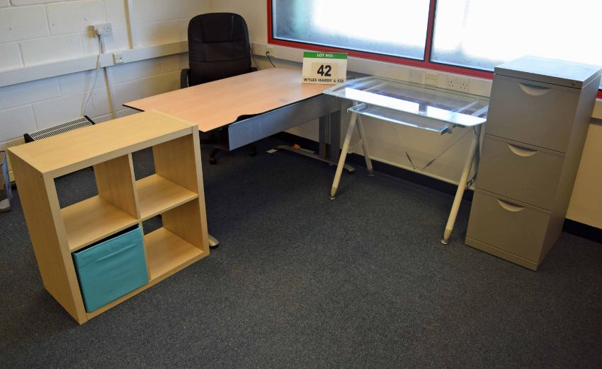 A Light Oak Effect Table, An Ash Effect Low Open 4-Section Storage Unit, A Glass Topped Table with Retracting Keyboard Board and A Grey Steel 3-Drawer Filing Cabinet complete with Keys