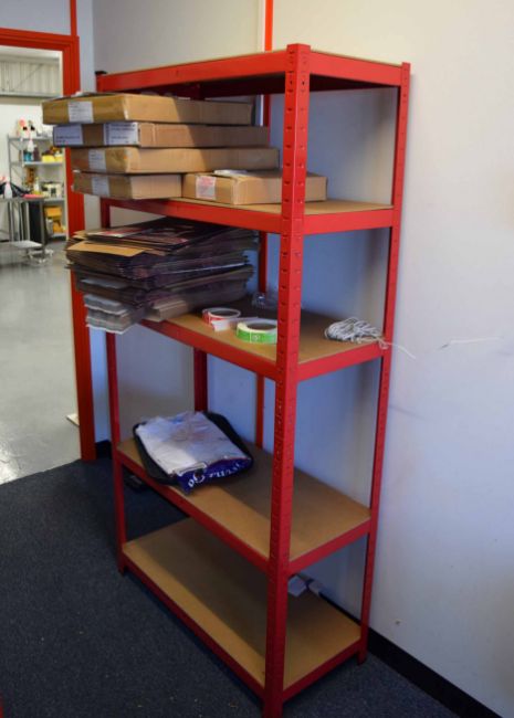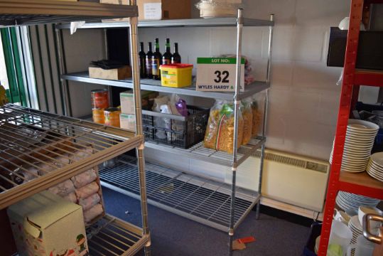 Two 1800mm x 580mm 4-Tier Wire Framed Shelf Racks and Two Red Steel Boltless Shelf Racks (Excludes Contents)