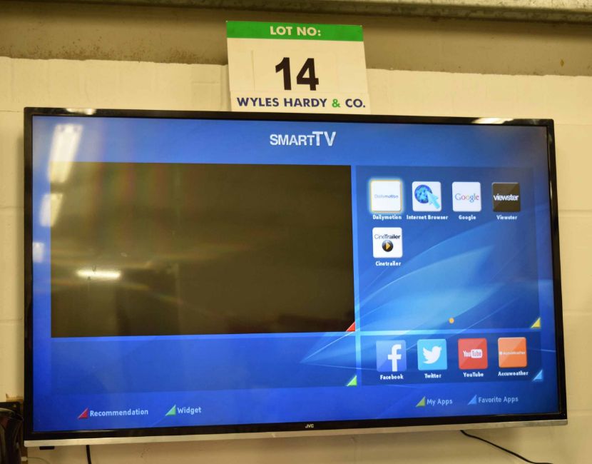 A JVC 50 inch LCD Smart Television with Wall Bracket and Hand Held Remote Control