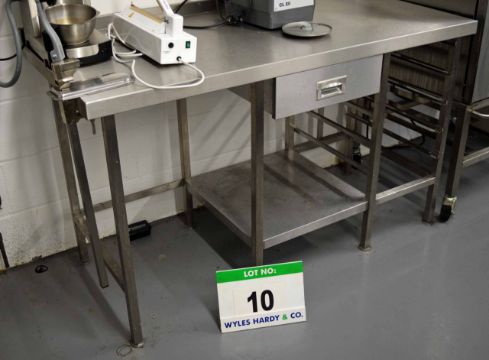A 1500mm x 680mm Stainless Steel Preparation Table with Rack Shelves to One Side and Single Drawer to Frieze and fitted Can Opener