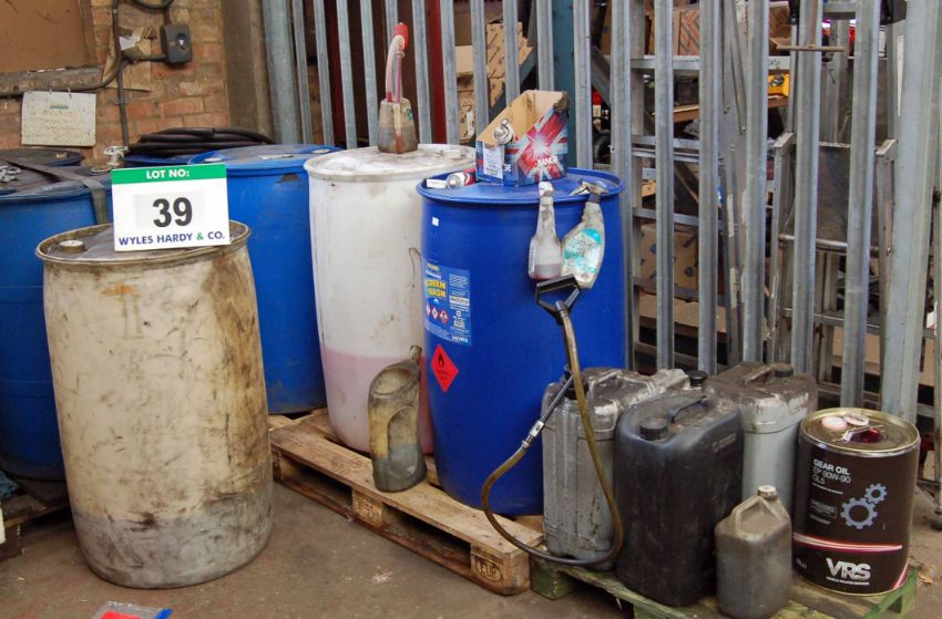 Seven Various Plastic Drums (205-Litres) with Contents each including Screen Wash and Five Various Plastic Containers with Contents and An Unused 20-Litre Tin of VRS EO80W-90 GL5 Gear Oil