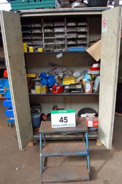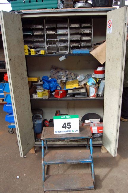 A Cream Steel 2-Door Cupboard with Contents comprising Various Nuts, Bolts, O-Rings, Rivets and A 3-Tread Steel Steps (As Photographed)