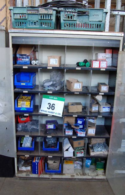 A Cream Steel Cabinet with A Quantity of Various Fittings including M12 M10 , M8 and M6 Bolts, MAHLE Fuel Filter, Oil Filters, Brake Pads, Rivets and Nuts (As Photographed)