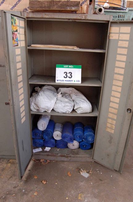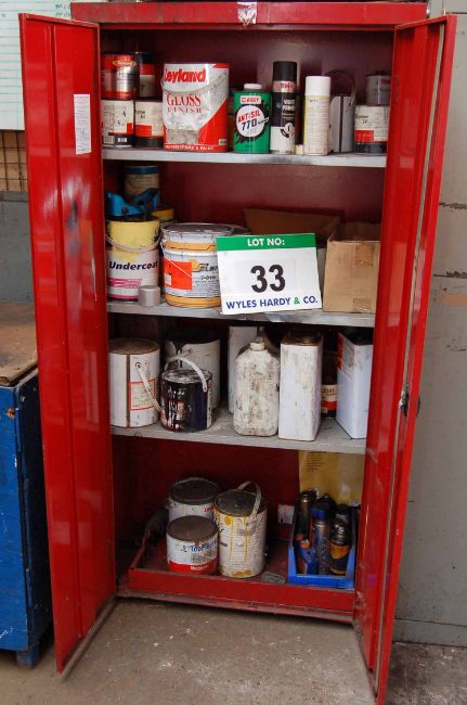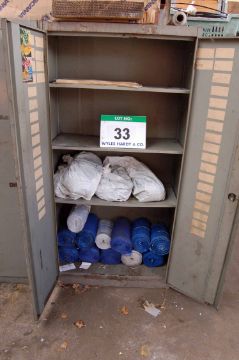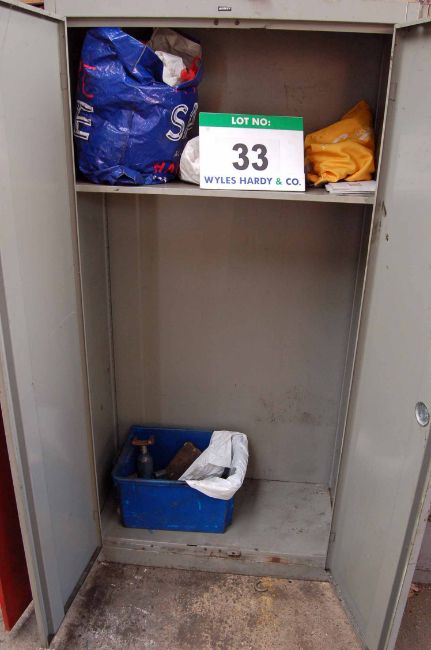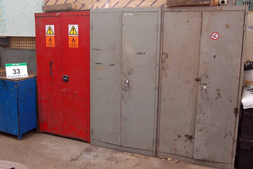 A Blue Steel 2-Door Cupboard, A Brown and Cream Steel 4-Drawer Filing Cabinet, A Timber Work Cabinet with RECORD No. 4 Vice (Contents Not Included with this Lot), A Red Steel 2-Door Flammables Cupboard with Contents, Two Various Grey Steel 2-Door Cupboards with Contents