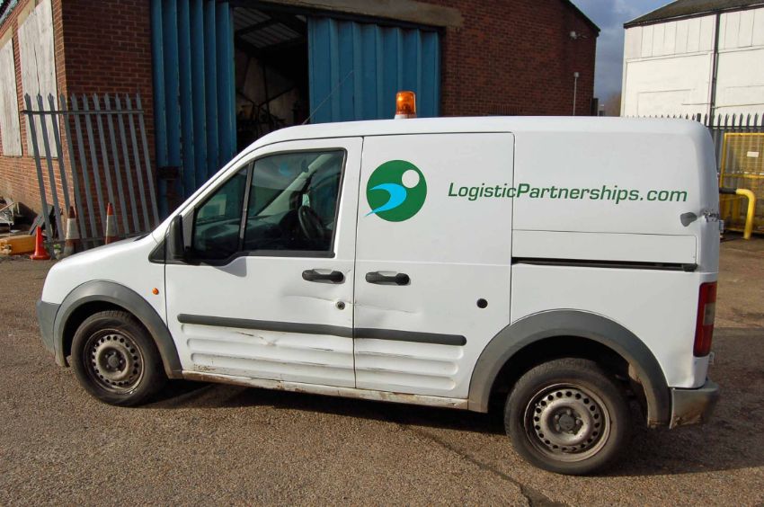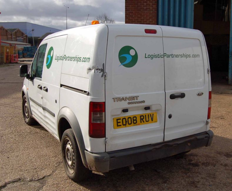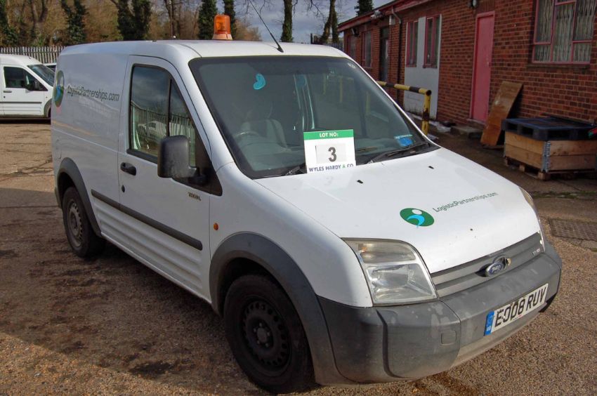 A FORD Transit Connect T200 L90, Diesel Panel Van, Registration No. EO08 RUV, First Registered: 31-03-2008, Recorded Mileage: 141289 miles, MOT Expires 25-04-2019, Colour: White, Vinyl Sign Written, with Plywood Lined Rear, Keys: One Remote Present. V5 Present, No Service Book (Viewing Recommended)