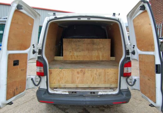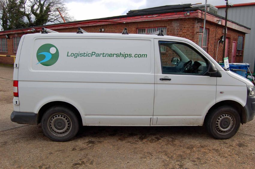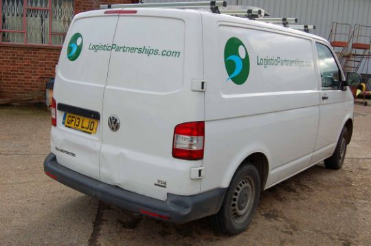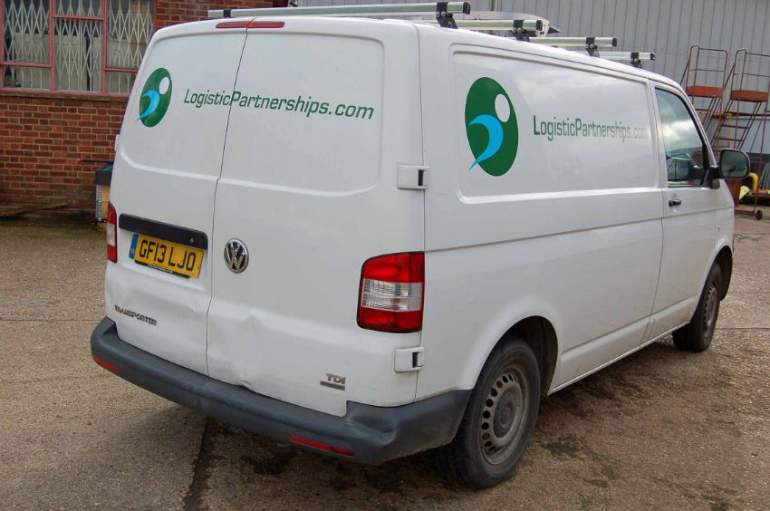 A VOLKSWAGEN Transporter T28 2.0 TDi Bluemotion, Diesel, SWB Panel Van, Registration No. GF13 LJO, First Registered: 12-06-13, Recorded Mileage: 94669 miles, MOT Expires: 10-07-2019, Colour: White, Vinyl Sign Written, with Four RHINO Demountable Roof Bars, fitted Air Conditioning and Plywood Lined Rear, Damage to Side Loading Door, Keys: One Remote and One Damaged Remote Present. V5 Present, No Service Book (Viewing Recommended)