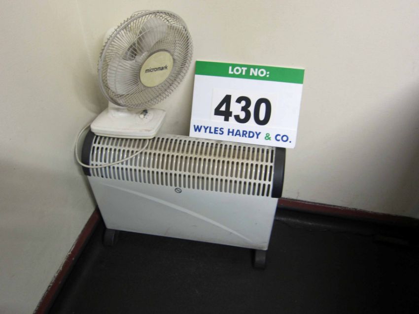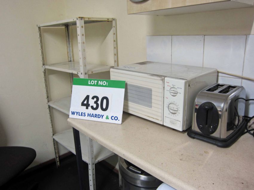 The Tea Room Furniture and Equipment including Two Tables, Four Chairs, A Steel Shelf, A Microwave Oven, A Toaster, A Kettle, A Noticeboard, An Electric Heater and A Fan