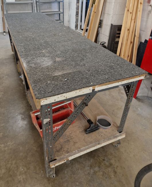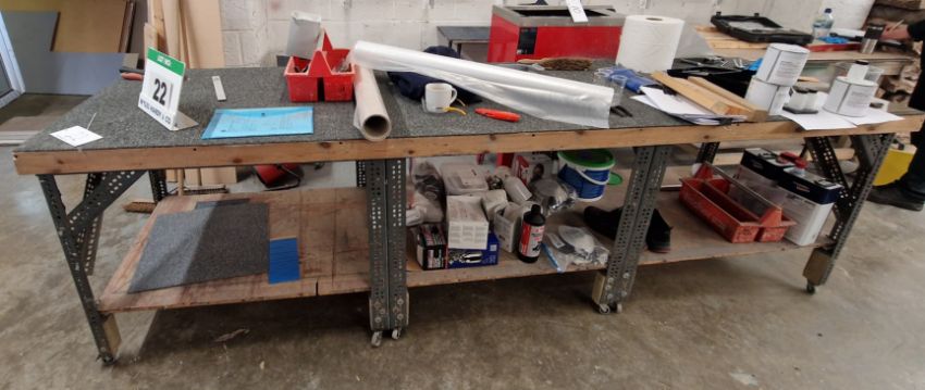 A Steel Framed 2-Tier Mobile Workbench, approx. 3100mm x 830mm x 920mm tall (N.B. Contents Not Included)