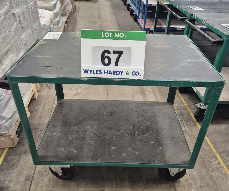 A EUROKRAFT BEG 500Kg capacity 2-Tier Green Steel Framed Trolley, 900mm tall x 700mm wide x 1050mm long with fitted Two Steering Castors